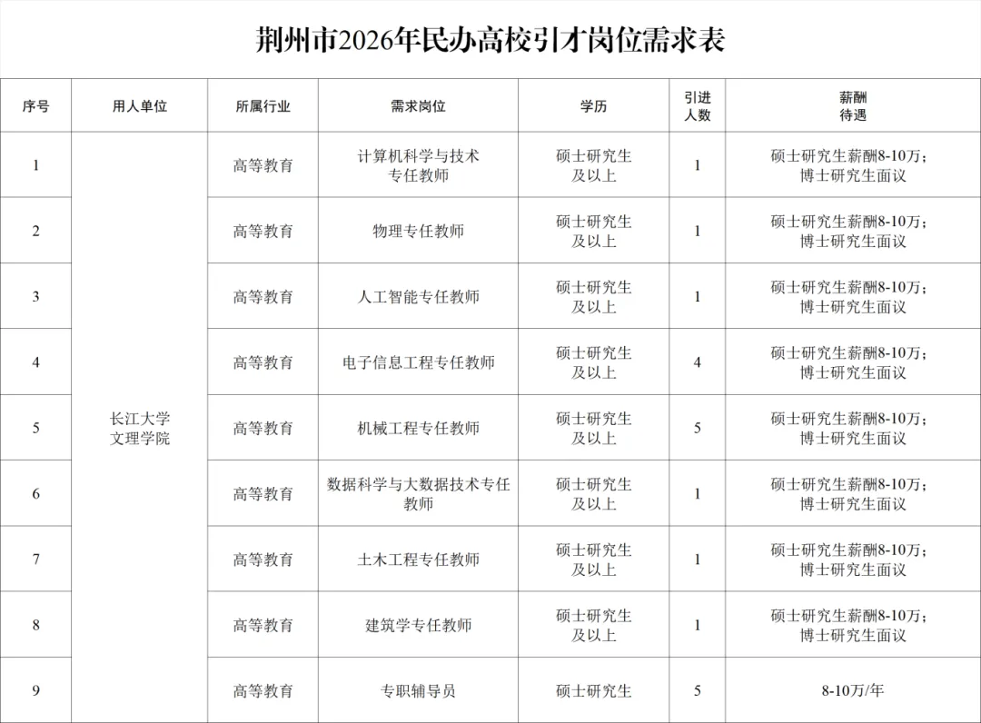 3.荆州市2026年民办高校引才岗位需求表