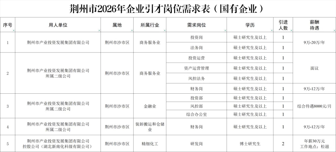 点击下载:荆州市2026年企业引才岗位90人完整需求表(国有企业)