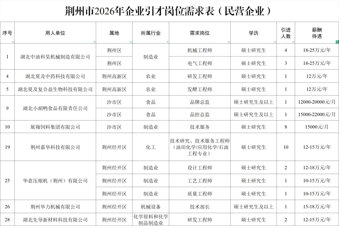 点击下载:荆州市2026年企业引才岗位160人完整需求表(民营企业)