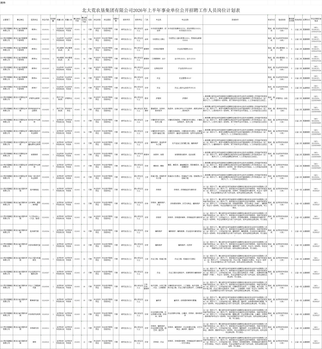 附件:北大荒农垦集团有限公司2026年上半年事业单位公开招聘工作人员岗位计划表