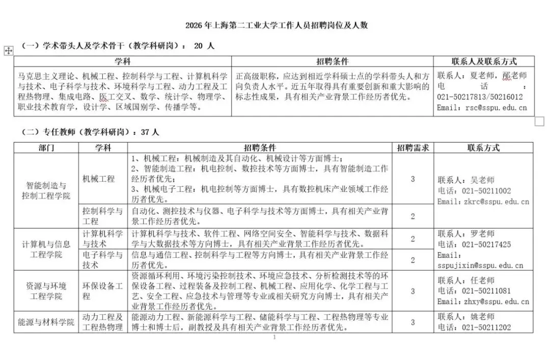 上海第二工业大学成立于1960年,是一所工科见长,多学科协调发展的市属普通高等学校,是上海市“高水平地方高校建设”培育单位,上海市应用型本科高校人才培养模式改革试点单位,硕士学位授权单位,博士学位授权单位建设(培育)单位,浦东新区博士后创新实践基地。学校设有16个二级教学单位,人才培养覆盖工学、管理学、经济学、理学、艺术学、文学、教育学、法学等8个学科门类,现有13个硕士学位授权点,50个本科专业,全日制在校生16000余人,教职员工近1200人,拥有国家级和省部级各类高层次人才近百人次。为进一步推进人才强校战略,优化师资队伍结构,根据《上海市事业单位公开招聘人员办法》(沪人社规〔2019〕15号)等文件精神及相关规定,结合学校实际,诚邀海内外优秀人才加盟。
