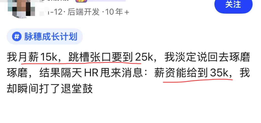 刚看到个贴子:有网友说自己月薪15k,跳槽面试直接开口要25k,临走还很淡定地说“回去考虑下”。结果第二天HR直接回:“35k可以给。”他却一下子慌了,开始打退堂鼓。