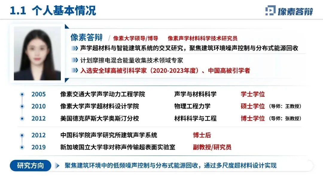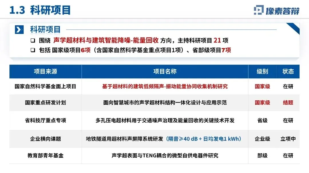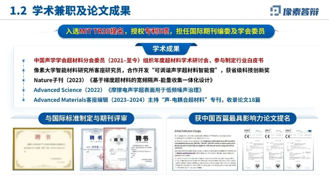 开篇直击声学超材料研究核心瓶颈(如宽频声波调控机理不明、设计方法缺乏系统性、工程化应用瓶颈突出),以 “多物理场耦合理论 - 结构功能一体化设计” 为桥定靶向;中段按 “个人基础 - 学术突破 - 支撑条件” 递进讲成果;结尾升华为声学工程领域 “理论 - 设计 - 制备 - 应用” 新范式,形成 “问题 - 突破 - 延展” 完整逻辑链。