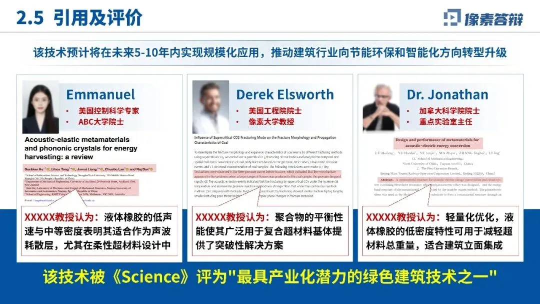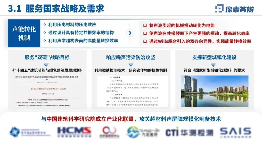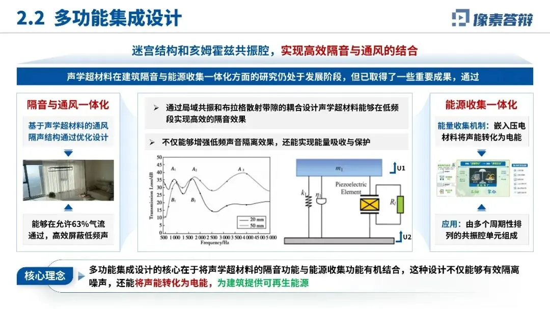 具象化三大核心贡献(如宽频带声学调控理论创新、高效声学超材料设计方法与制备技术突破、典型场景应用验证),用表格清晰呈现核心成果;从理论阐释、核心技术、应用场景(噪声控制、声隐身、医学超声等)三维凸显差异化优势;研究方法依托声学、力学与材料科学成熟理论,经 “理论建模 - 仿真分析 - 样品制备 - 性能测试 - 应用示范” 多层级验证,强化成果严谨性。