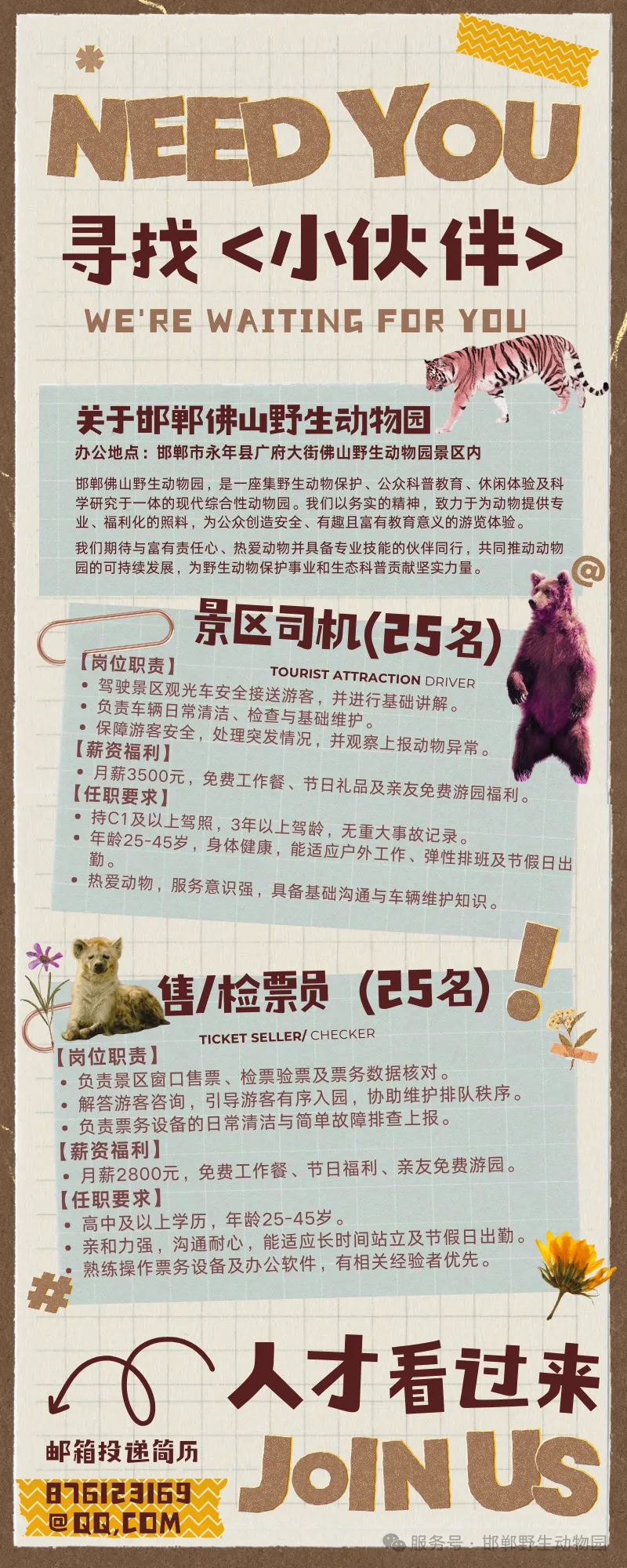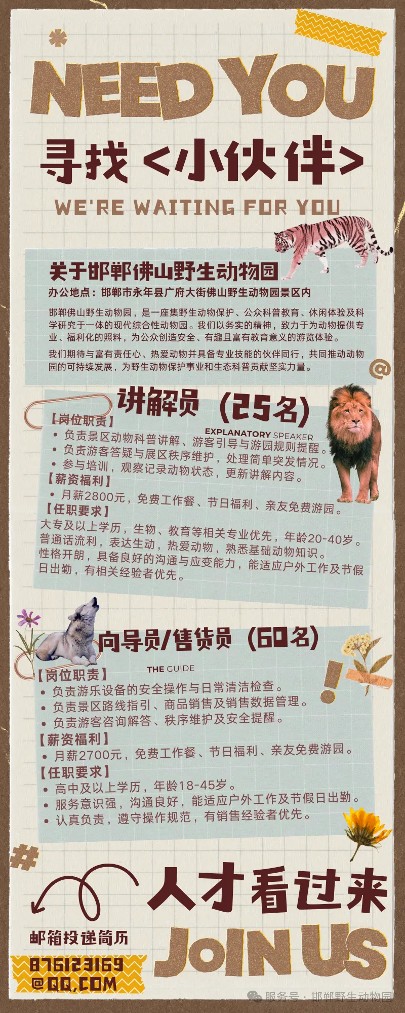 如果你已经心动,那就赶快行动!简历投递:876123169@qq.com(邮件主题请注明:应聘职位+姓名)园区地址:河北省邯郸市永年区新安村2号邯郸市佛山野生动物园