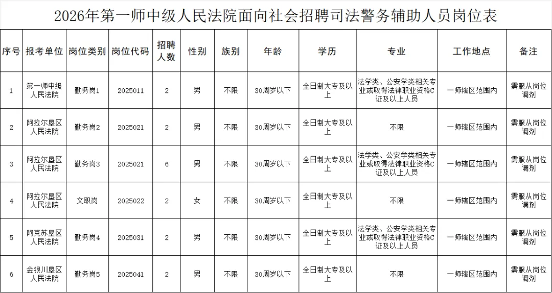附件:1.2026年第一师中级人民法院面向社会招聘司法警务辅助人员岗位表.xlsx