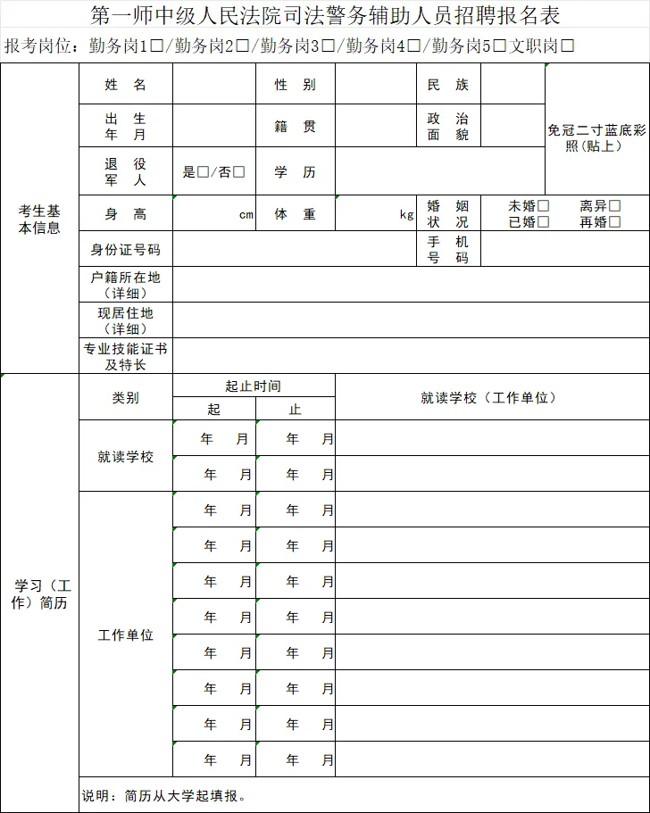 ①填写《司法警务辅助人员报名表》(含个人近期免冠二寸蓝底彩照)(提供电子版);