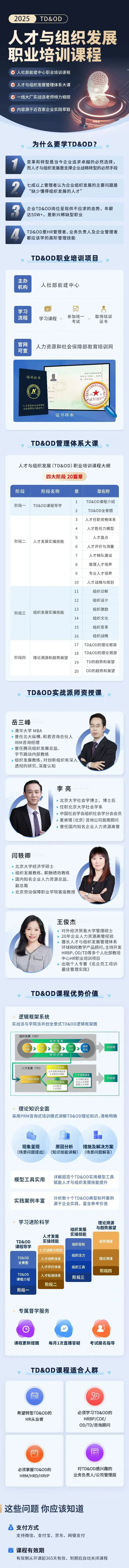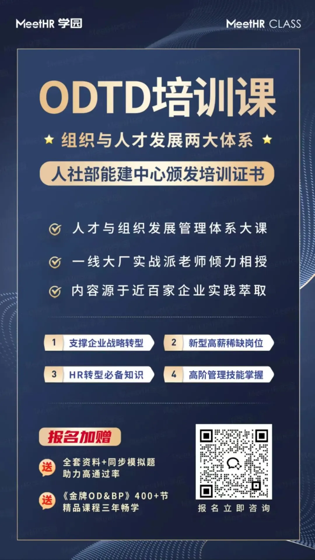人才与组织发展经理”职业培训包含组织发展 OD与人才发展 TD。组织发展 OD 是运用组织诊断等工具,依据组织战略,通过组织设计、组织激励、组织人才、组织文化等手段,实现组织创新变革,不断提升组织能力的人力资源高端岗位。人才发展 TD 负责企业的人才发展工作,以人才战略与规划为指引,构建人才标准体系,人才评估体系,以及人才培养体系,帮助组织发挥长期优势、为组织持续提供关键人才的人力资源高端岗位。变革和转型是当今企业追求卓越的必然选择,而人才与组织发展是支撑企业战略转型的必然手段。七成以上管理者认为企业组织发展的主要问题是“缺少懂得组织发展的人才”,企业的人才与组织发展岗位呈现供不应求的态势,是新兴稀缺型职业;同时人才与组织发展也是 HRBP、COE、HR 管理者、业务负责人及企业管理者都应该学的高阶管理技能。- 累计从事本职业或相关职业①工作 2 年 (含) 以上;