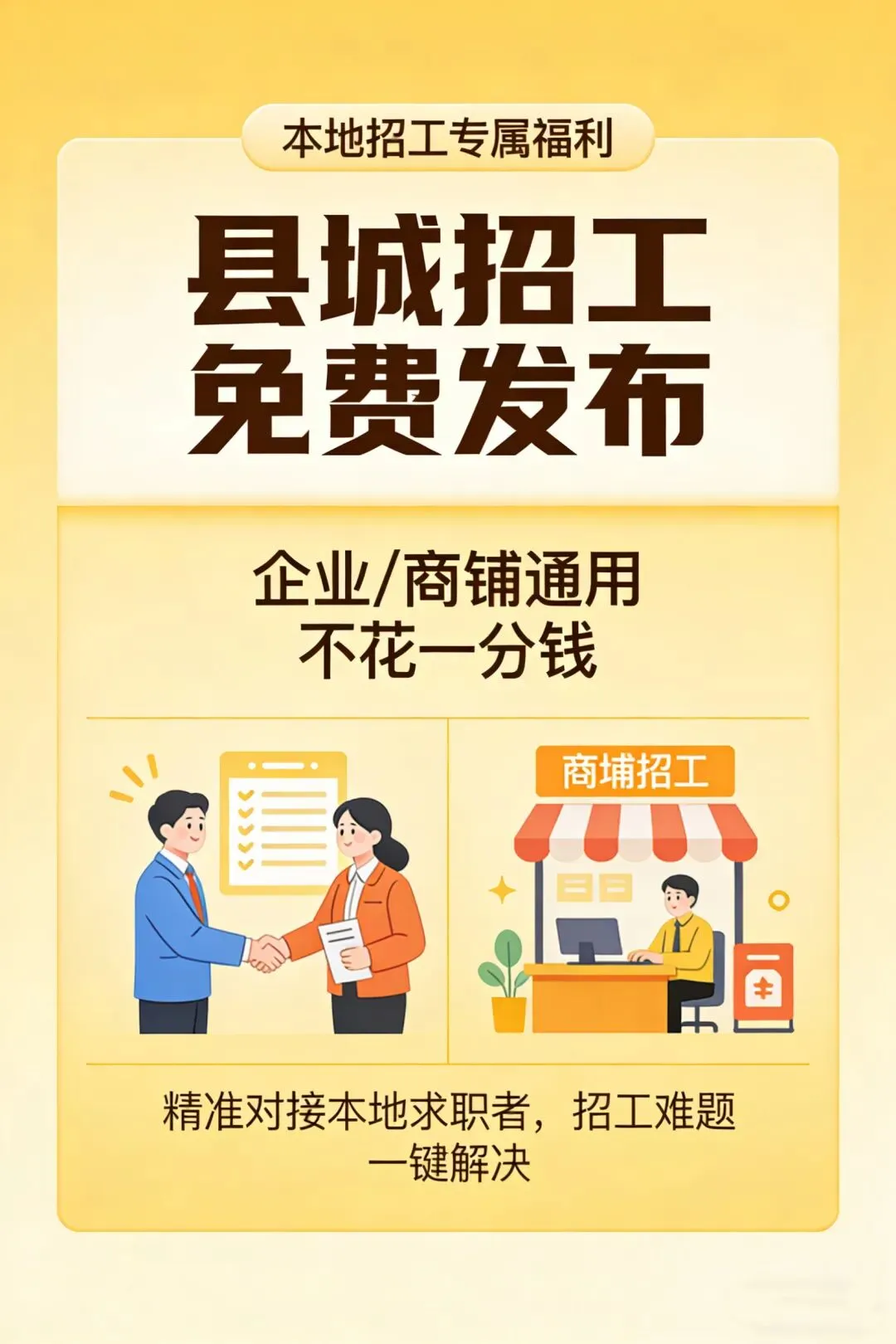 咱县城的企业、店铺注意啦!招工不用花一分钱!专业帮你免费发招聘信息,本地求职者精准看,招人快人一步,有需求直接来!