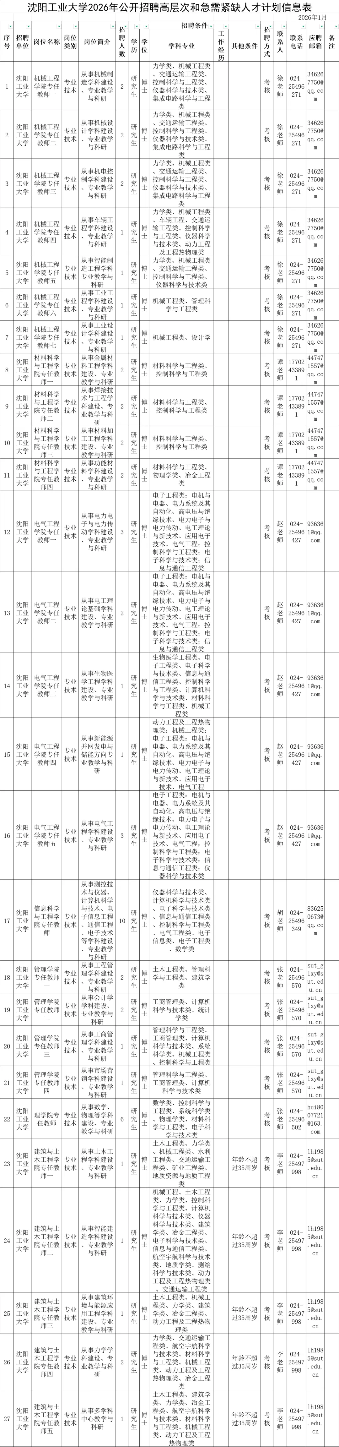 附件1:《沈阳工业大学2026年公开招聘高层次和急需紧缺人才计划信息表》