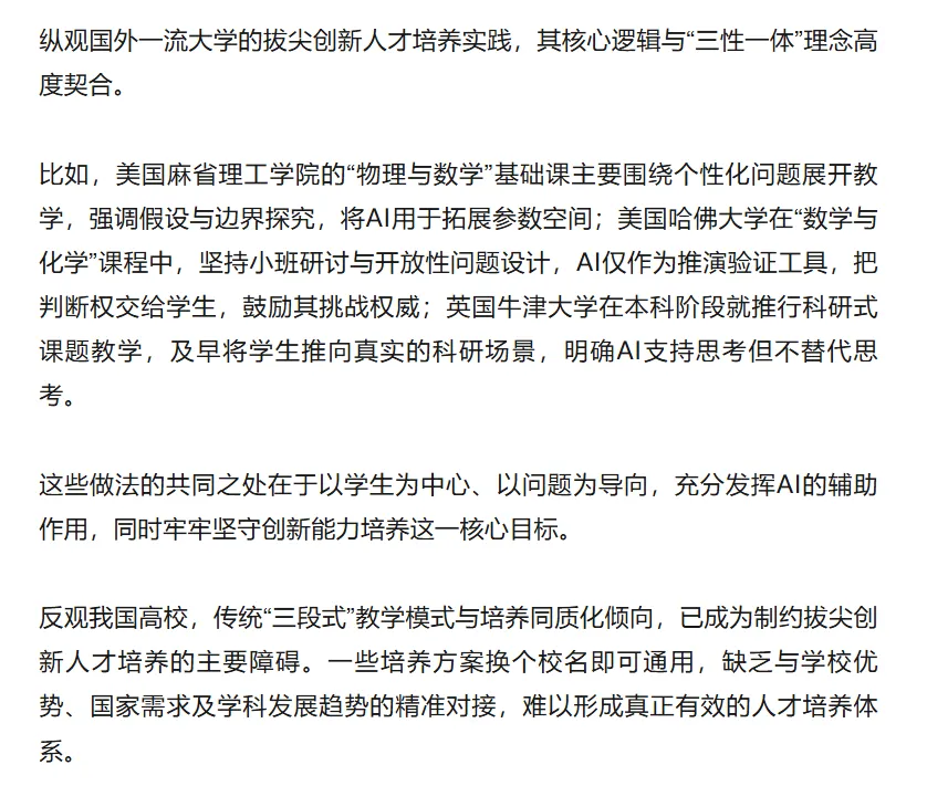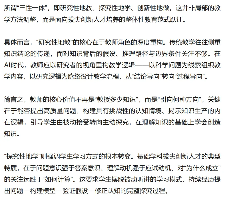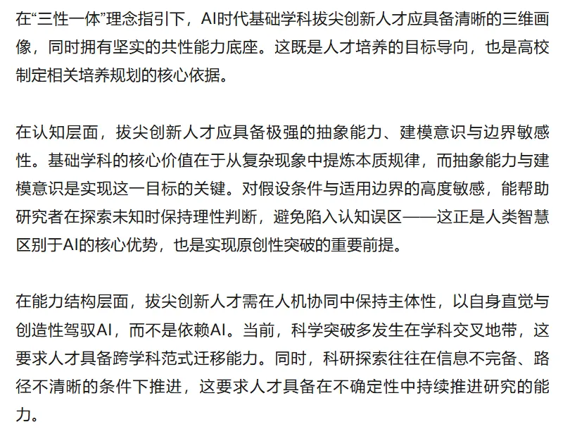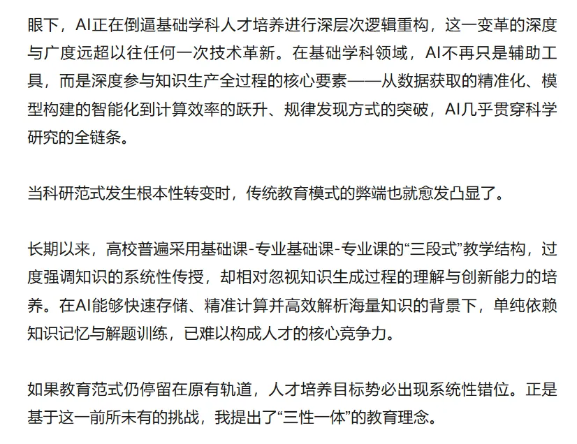 在我看来,在AI时代,基础学科拔尖创新人才培养应坚持并做到“三性一体”。