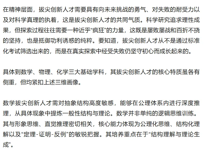 特别值得一提的是人机协作研究能力——既善于运用AI拓展研究边界,也要具备判断模型合理性、识别AI“伪合理结果”的批判性思维。在AI仍存在“幻觉”问题的现实背景下,这种甄别能力已成为基础学科拔尖创新人才的必备素养。