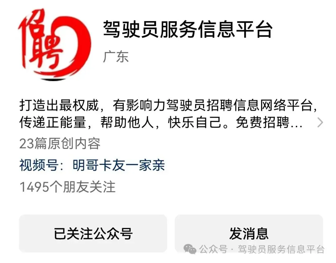 免责声明:本平台仅提供需求展示服务,所有信息均来源于网络,请仔细辨别,谨防上当受骗!如因信息真实性或使用过程中产生的任何问题,本平台不承担任何法律责任。本公众号信息来自网络及驾驶员招聘信息平台,旨在为广大驾驶员提供便利。我们已创建数百个全国各地区车主及司机招聘群,感谢大家的支持!
