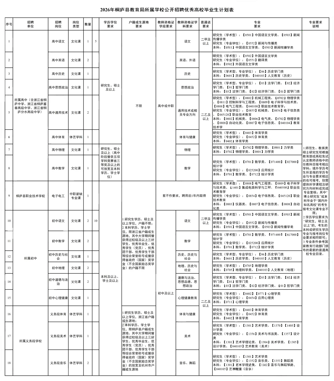 1:2026年桐庐县教育局所属学校公开招聘优秀高校毕业生计划表
