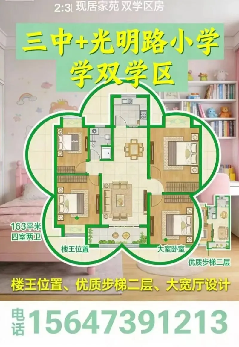 现居家苑置,优质楼层步梯二层,大宽厅设计,四室两卫大暖居。单元住户素质高!现在租状广纳广恒物业招聘1.30