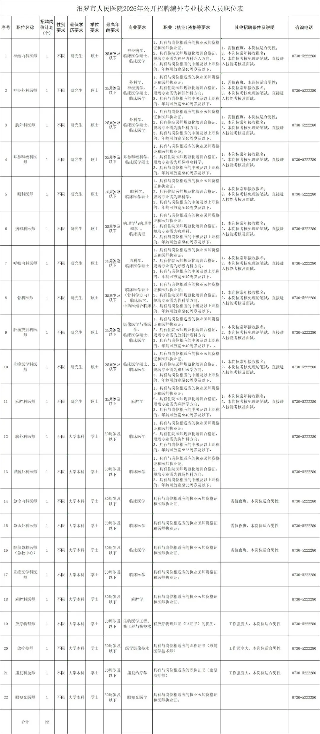 咨询电话:汨罗市人民医院人事科0730-5222280