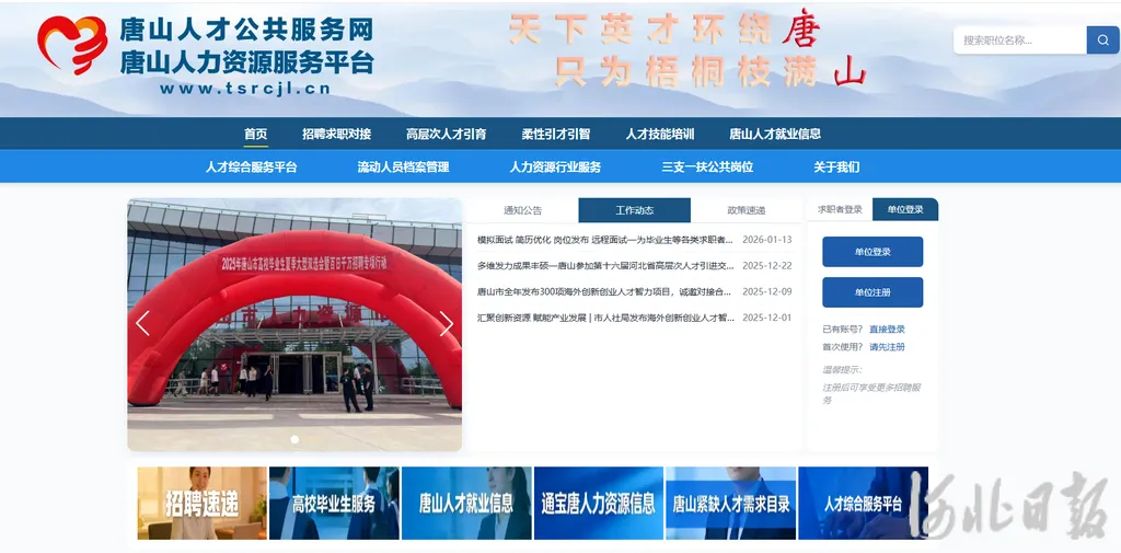 近日,唐山人才公共服务网(唐山人力资源服务平台)上线试运行,网址为www.tsrcjl.cn。该网站由唐山市人社局、唐山市人才交流中心主办,以“统一门户、数据驱动、智能赋能、服务升级”为核心,提供人才交流、引才引智等公共人才服务。