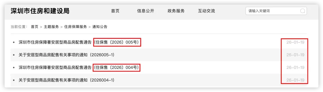 1、深圳市住房保障署安居型商品房配售通告(住保售〔2026〕004号)https://zjj.sz.gov.cn/ztfw/zfbz/tzgg2017/content/post_12606772.html