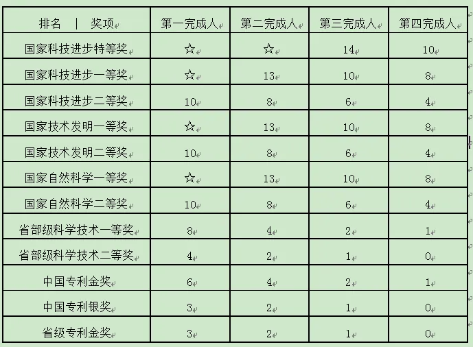 (四)近10年内所承担科研项目获得以下奖项,并按下列计算标准累计所得分值在15分以上的人才。如同一个项目获多个奖项,只按其最高分值计分一次,不重复计分。“☆”对应奖项直接入选A类人才。