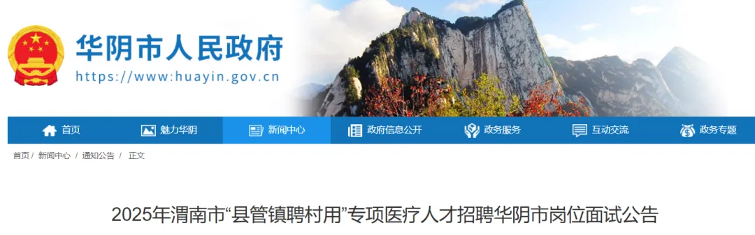2025年渭南市“县管镇聘村用”专项医疗人才招聘华阴市岗位资格复审工作已经结束,按照《2025年渭南市“县管镇聘村用”专项医疗人才招聘公告》和《2025年渭南市“县管镇聘村用”专项医疗人才招聘笔试成绩查询及资格复审等工作安排的公告》有关要求,现将2025年渭南市“县管镇聘村用”专项医疗人才招聘华阴市岗位面试有关事项公告如下: