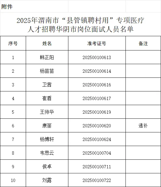 附件:2025年渭南市“县管镇聘村用”专项医疗人才招聘华阴市岗位面试人员名单.