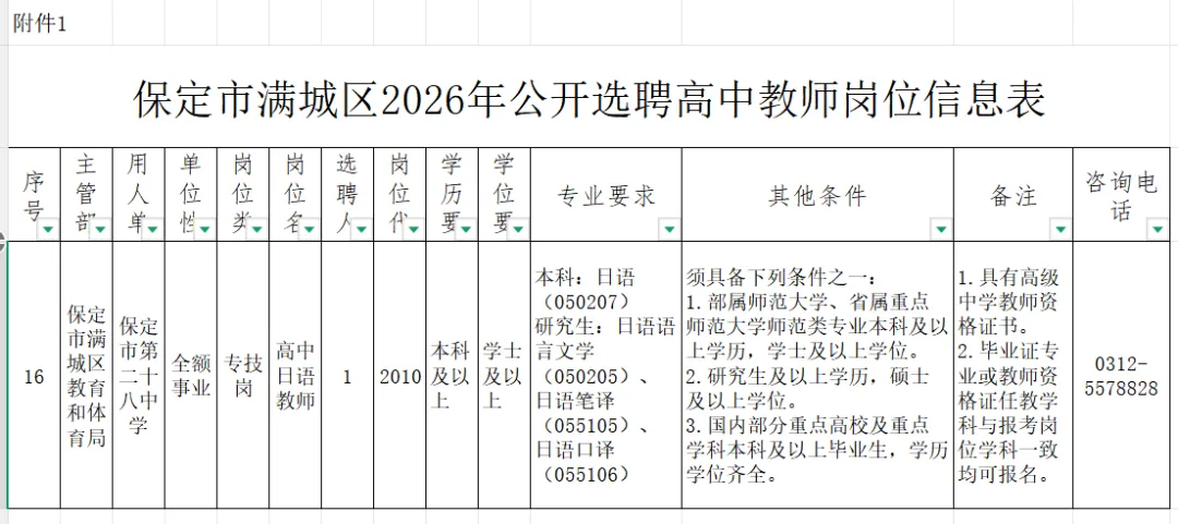 附件:1.2026年保定市满城区公开选聘高中教师岗位信息表