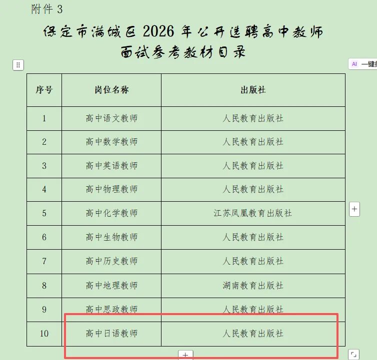 3.面试采取试讲的方式,时间10分钟(面试前有9分钟的备课时间)。试讲内容按报考岗位在满城区现行教材中随机抽取。教材版本参照《2026年保定市满城区公开选聘高中教师面试参考教材目录》(附件3)。