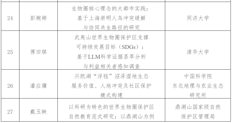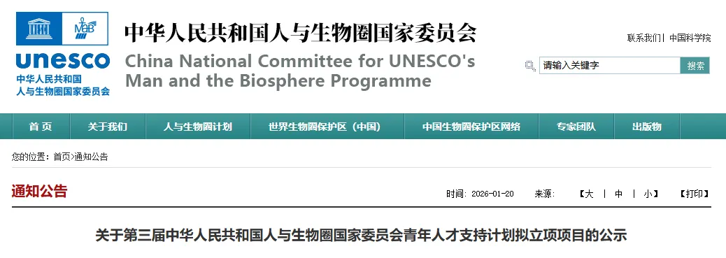 2025年10月31日,我秘书处公开发布第三届中华人民共和国人与生物圈国家委员会青年人才支持计划项目申报的通知,得到了国内科研院所、高校和“中国生物圈保护区网络”成员单位等的积极响应。经个人申报和单位推荐,我秘书处共收到126份申报材料,数量和质量创历史新高。根据专家评审意见及新形势下中国实施联合国教科文组织“人与生物圈计划”的战略布局,拟对“世界生物圈保护区可持续发展智库平台建设:基于卧龙保护区治理体系的研究”等27个项目予以立项,现予公示。