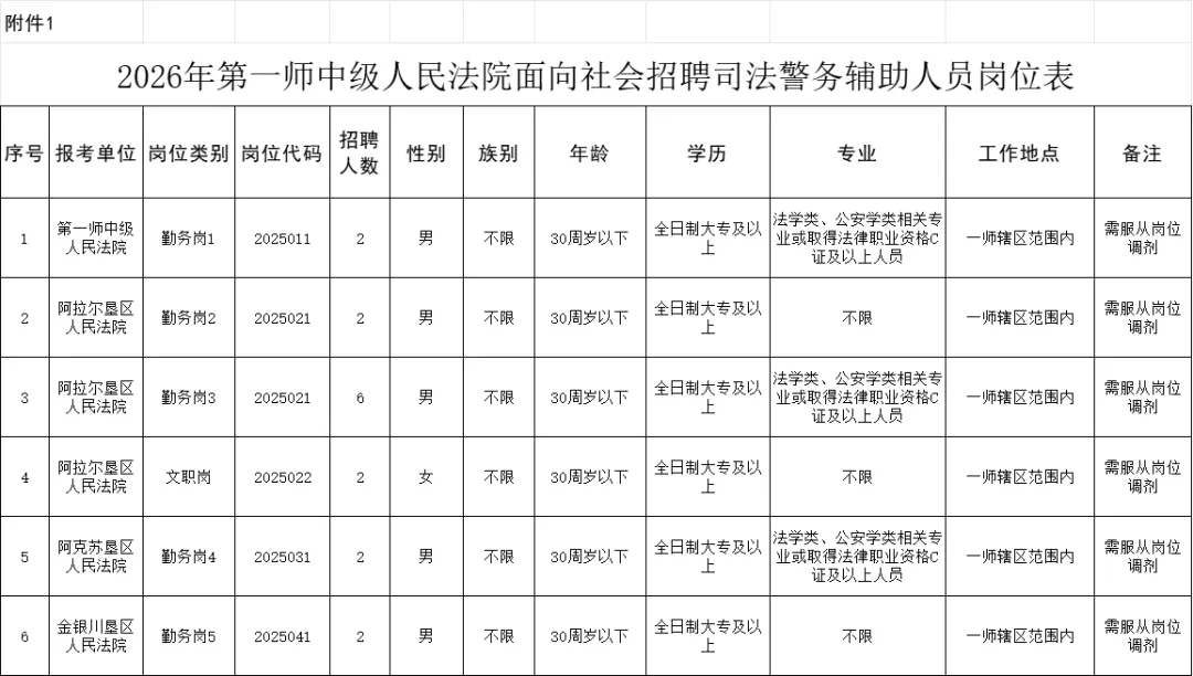 根据岗位性质和工作任务,本次计划面向社会公开招聘辅警16名,招聘岗位人员为合同制,不具备公务员、司法警察、事业编制人员身份。具体岗位要求详见《2026年第一师中级人民法院面向社会招聘司法警务辅助人员岗位表》。