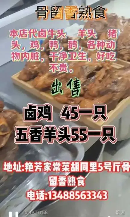 出售卤鸡 45一只,五香羊头55一只。