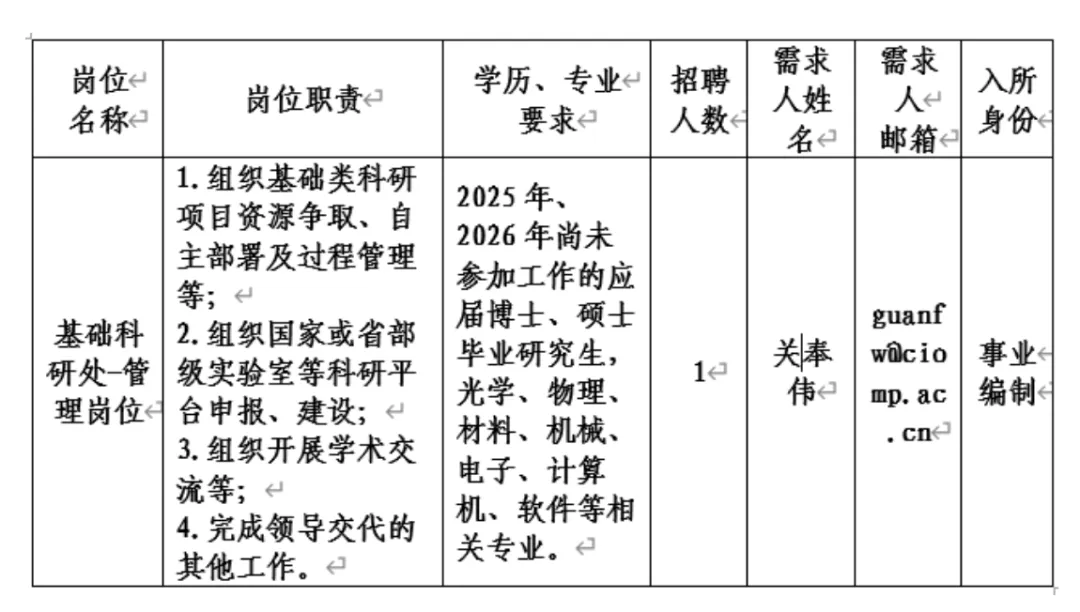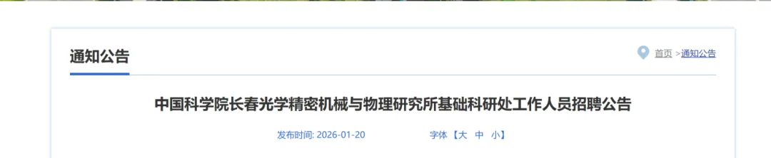 中国科学院长春光学精密机械与物理研究所网站发布公告,招聘基础科研处工作人员岗位,入所身份为事业编制人员。详情如下: