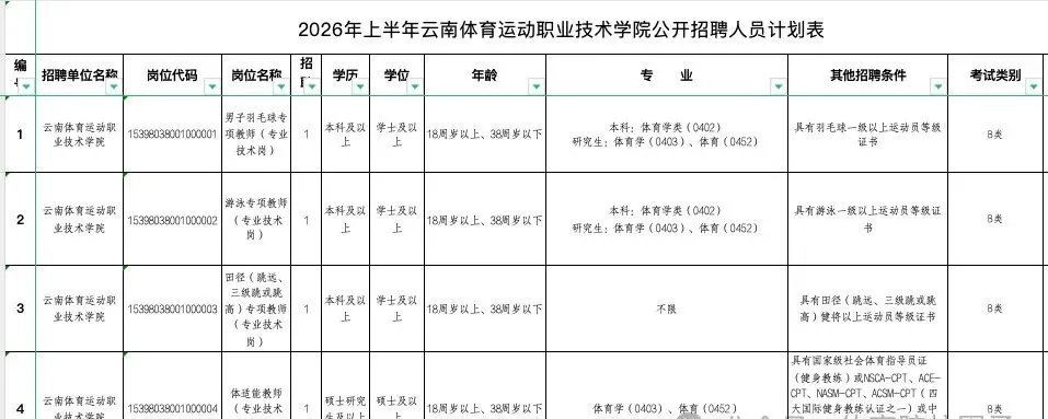 云南体育运动职业技术学院公开招聘人员20名。具体招聘岗位及招聘条件,详见《2026年上半年云南体育运动职业技术学院公开招聘人员计划表》(附件1)。