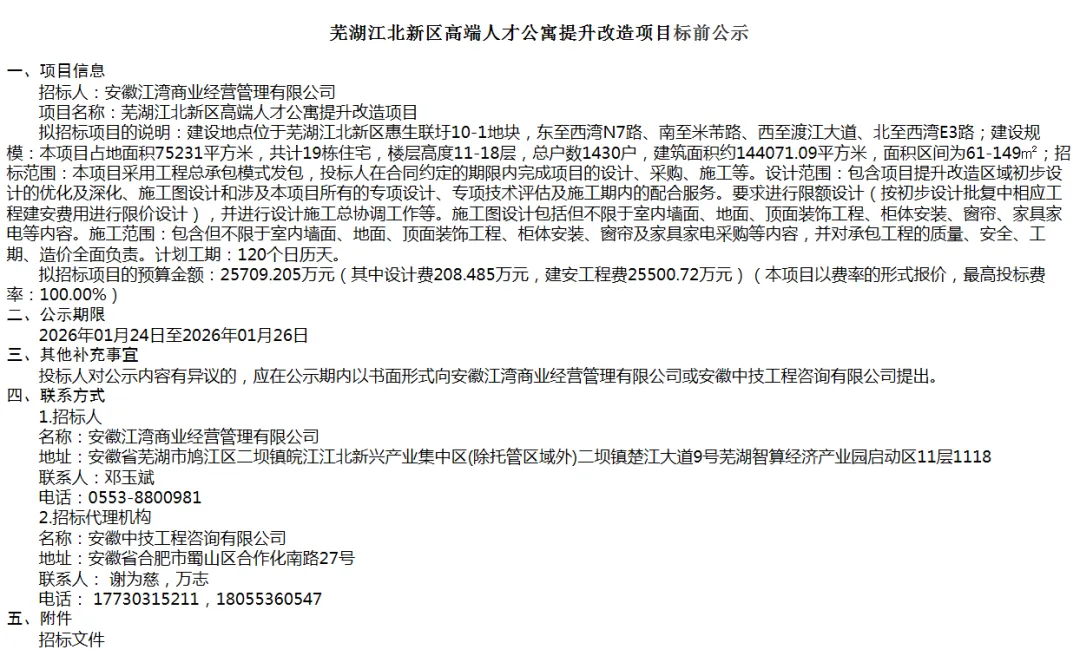 《公告》显示:芜湖江北新区高端人才公寓项目占地面积75231㎡,共计19栋住宅,楼层高度11-18层,总户数1430户,建筑面积约144071.09㎡,户型面积区间为61-149㎡。