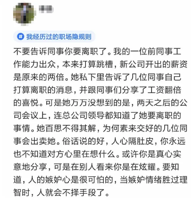 有的人担心有些人会假装跟你套近乎,打探你的离职去向和薪资待遇,然后偷偷告诉领导,或者背后使绊子。