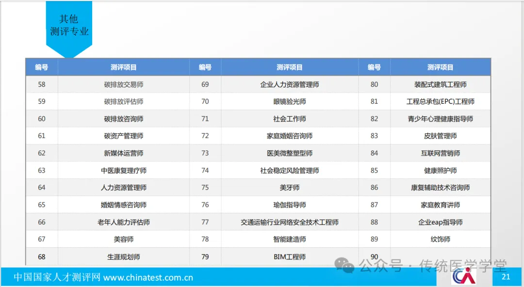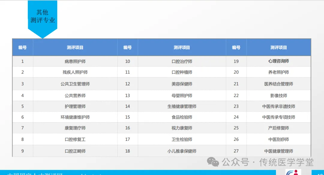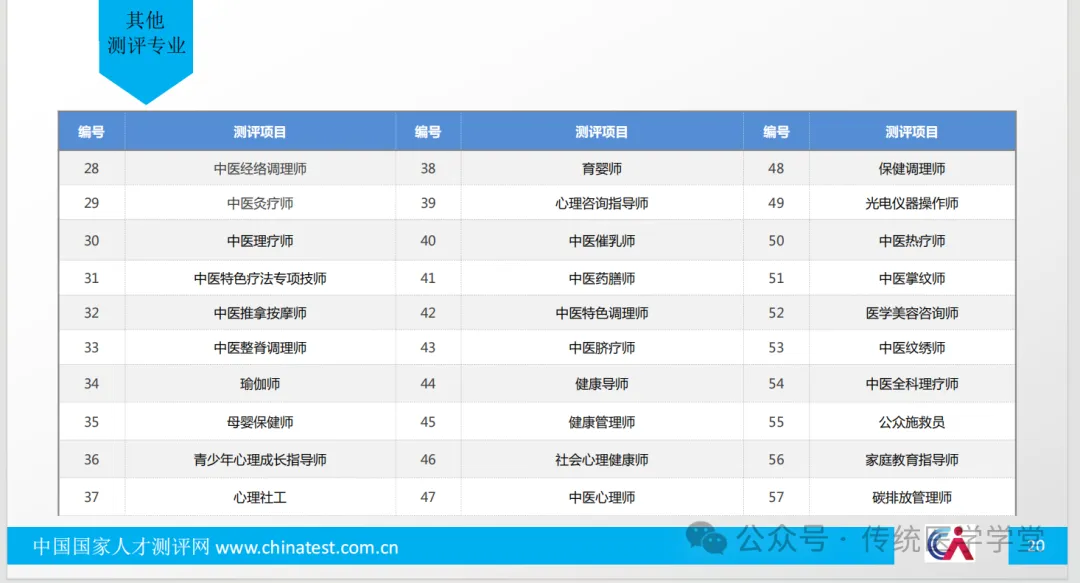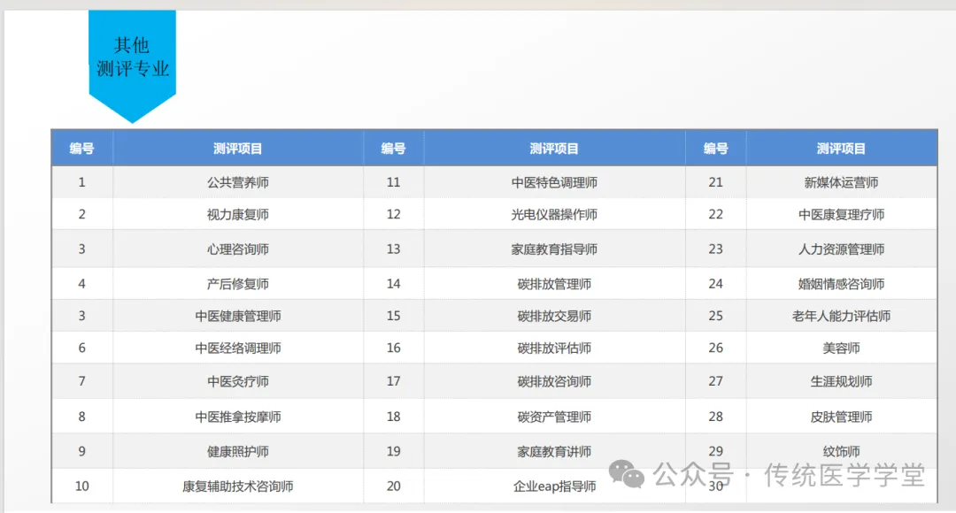 一、考培专业:病患照护师、残疾人照护师、公共卫生管理师、公共营养师、护理管理师、康复理疗师、纹饰师、互联网营销师、社会稳定风险管理师、社会工作师、美容保健师、母婴照护师、企业合规师、食品检验师、视力康复师、卫生检验师、小儿推拿保健师、养老照护师、医养结合管理师、影像技师、中医传承非遗技师、中医传承专项技师、中医刮疹师、中医健康管理师、中医经络调理师、中医灸疗师、中医理疗师等114工种。