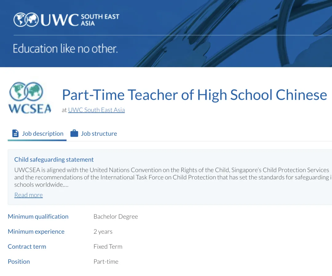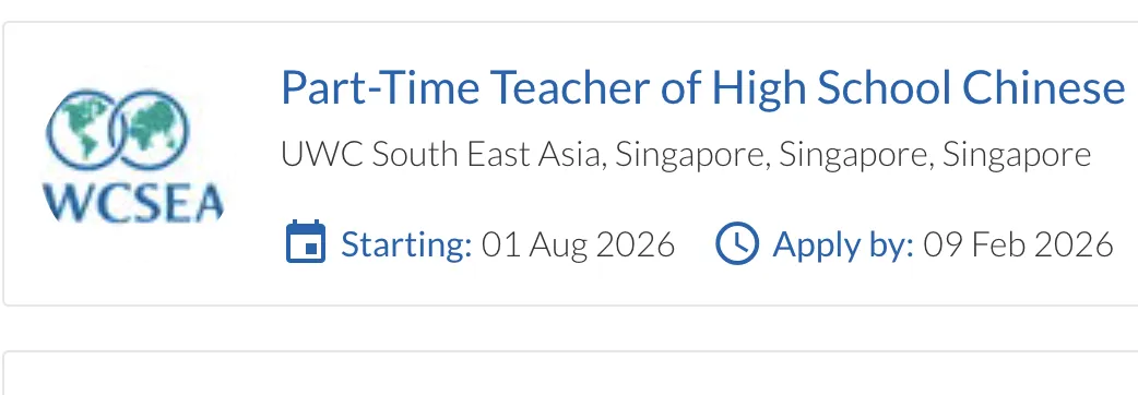 UWCSEA East has a part-time vacancy for a Teacher of High School Chinese from August 2026.The appointee will teach High School and must be experienced in teaching Chinese to this age group. preferably with recent IBDP teaching experience, along with a background in teaching IGCSE , MYP, or an equivalent Grade 9-10 curriculum. The applicant needs to demonstrate their capacity to teach both first language and foreign (beginners and continuation/second) language courses in Grade 9-12. Please state if you have recent experience in teaching Chinese at these levels.