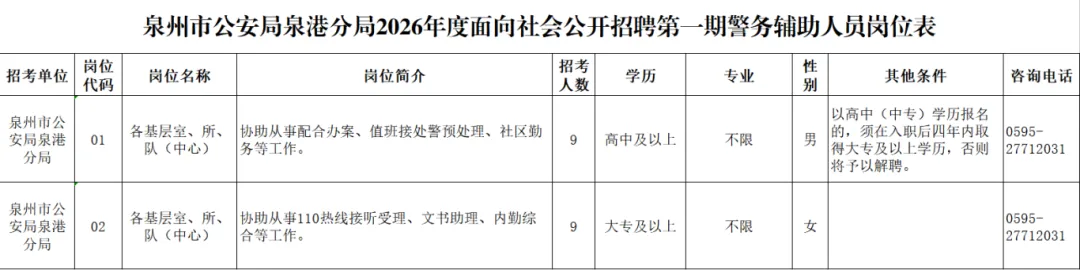 附件1:泉州市公安局泉港分局2026年度面向社会公开招聘第一期警务辅助人员岗位表