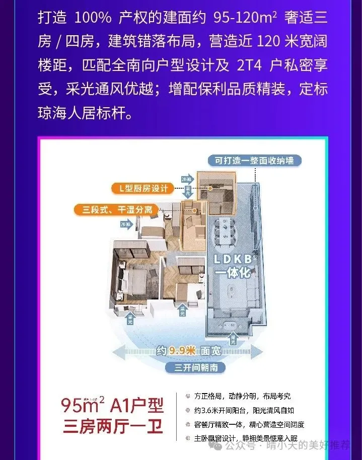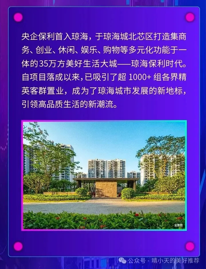 【保利时代·人才公寓,安居型商品住房95㎡-120㎡】千亿央企品牌开发商 城北未来城市中心 户型方正,南北通透保利时代·人才公寓(二期)占地6.9万 ㎡,是保利发展控股在“和保利·筑海南”为品牌愿景下,沿东线开发的琼海首个安居房项目,位于琼海市城北区新兴开发区域。产品类型为高层住宅,建筑造型美观,立面设计,采用现代风格。在设计中注重沿海城市气氛的渲染和亲切怡人尺度的创造。仪式归家入口 : 人车分流管理系统+迎宾水景+尊贵归家多功能聚会草坪 : 沐浴阳光+邻友畅谈+户外体验+活动草坪+丰富植物组团+休闲平台+户外休憩座椅+享受自然亲子互动活动场地:互动游戏+年龄段游玩+邻里交流+休闲座椅全龄康体活动场地:关爱与健康+交流与互动+休闲与活动保利物业隶属保利发展集团,拥有国家一级物业资质,涵盖住宅、写字楼、政府办公楼、商业综合体等多种业态。保利物业坚持诚信服务,维护客户利益,为客户提供全程专业的物管服务。扫描二维码添加客服微信,了解全海南最高性价比楼盘,参与海南百盘团购活动。开启您海南度假养生之旅....我们海南房产推荐。为您筛选,为您省钱,为您售后保障!一站式服务,省去波折不便!让您花最少的钱买到最心仪的房子,是我们追求的目标!了解海南房子、随心看海南房子联系:15208971852声明:关于该楼盘描述内容及图片部分来源于该楼盘相关工作人员提供、部分来源于网络。该项目房源介绍仅供参考了解,实际楼盘房源及价格以该楼盘开发商实际为准。如有错别地方及版权和其它问题,请及时联系我们!(图文源于网络,版权归原作者所有,如有侵权,请告知小编删除)