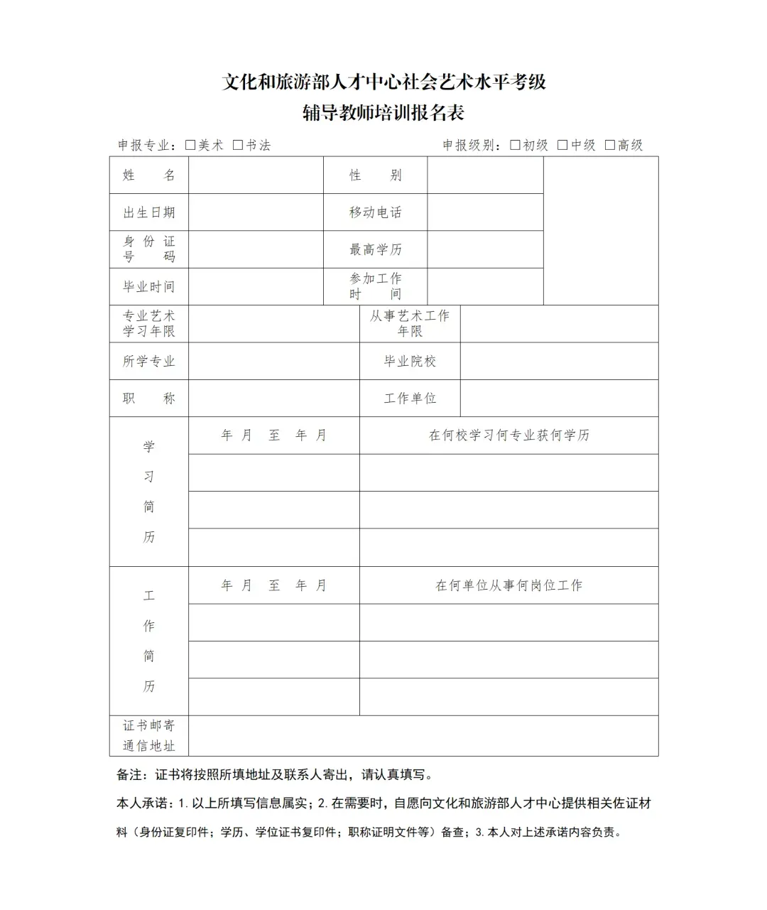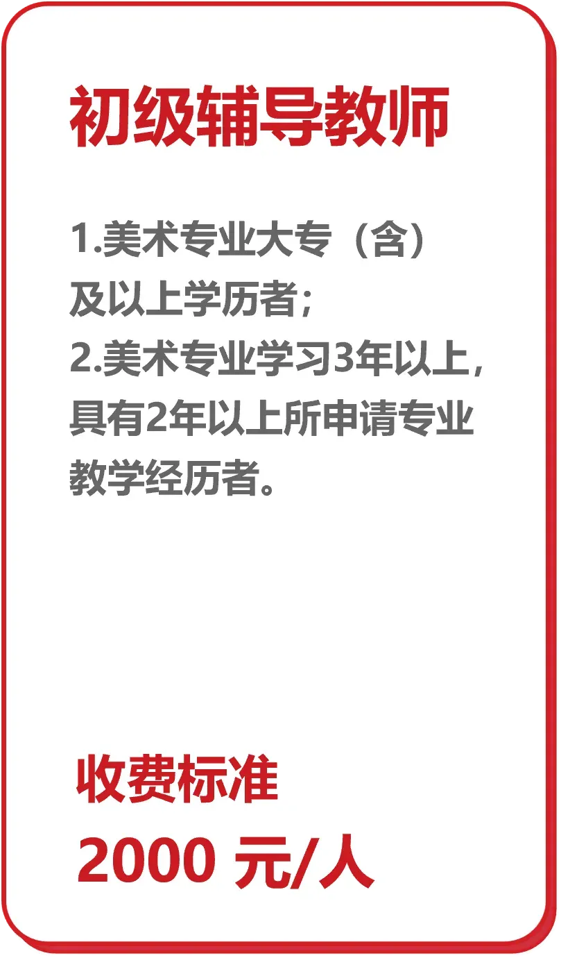 报名学员应爱国守法、恪尽职守,有正确的人生观、世界观、价值观;政治立场坚定,拥护中国共产党的领导和中国特色社会主义制度,有全局观念和大局意识;讲究仪表,举止文明,尊重民族宗教风俗和习惯;有正常履行职责的身体条件;工作严谨,认真负责,踏实敬业,热爱艺术教育工作,落实美术专业考级的理念和初衷,保证考级的科学性、规范性、实用性。人才中心社会艺术水平考级美术专业辅导教师按需求分为初级辅导教师、中级辅导教师、高级辅导教师三个等级。学员应满足相应等级的报名要求。(需满足对应条件之一)01 初级辅导教师