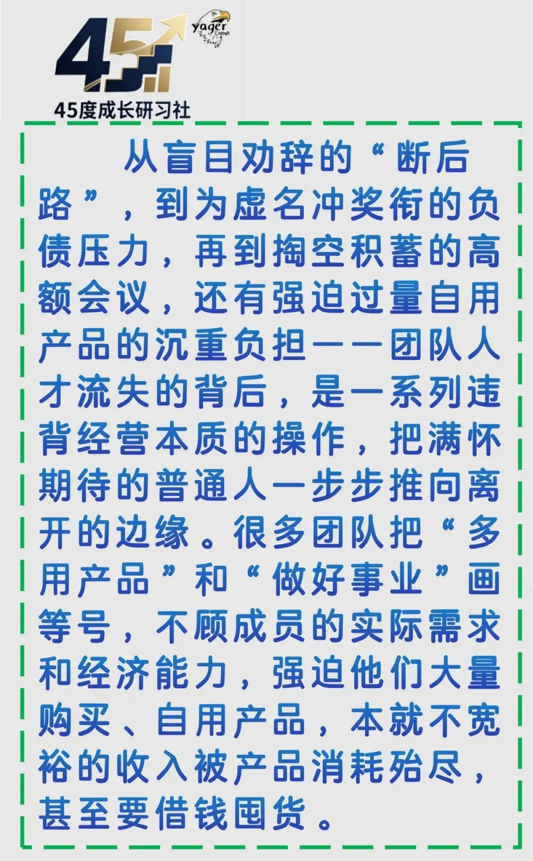 (要奖衔?还是要生意?还是要钱?请认真思考!!!) 在直销行业,一些老师为了达成个人目标,常对团队成员打“感情牌”。他们会说:“我在你身上投入了很多时间和精力,现在该你支持我了。”还会强调:“只有我上了奖衔,团队才有更多资源,才能更好地帮到你。”可这种做法,却让很多营销人员陷入困境。