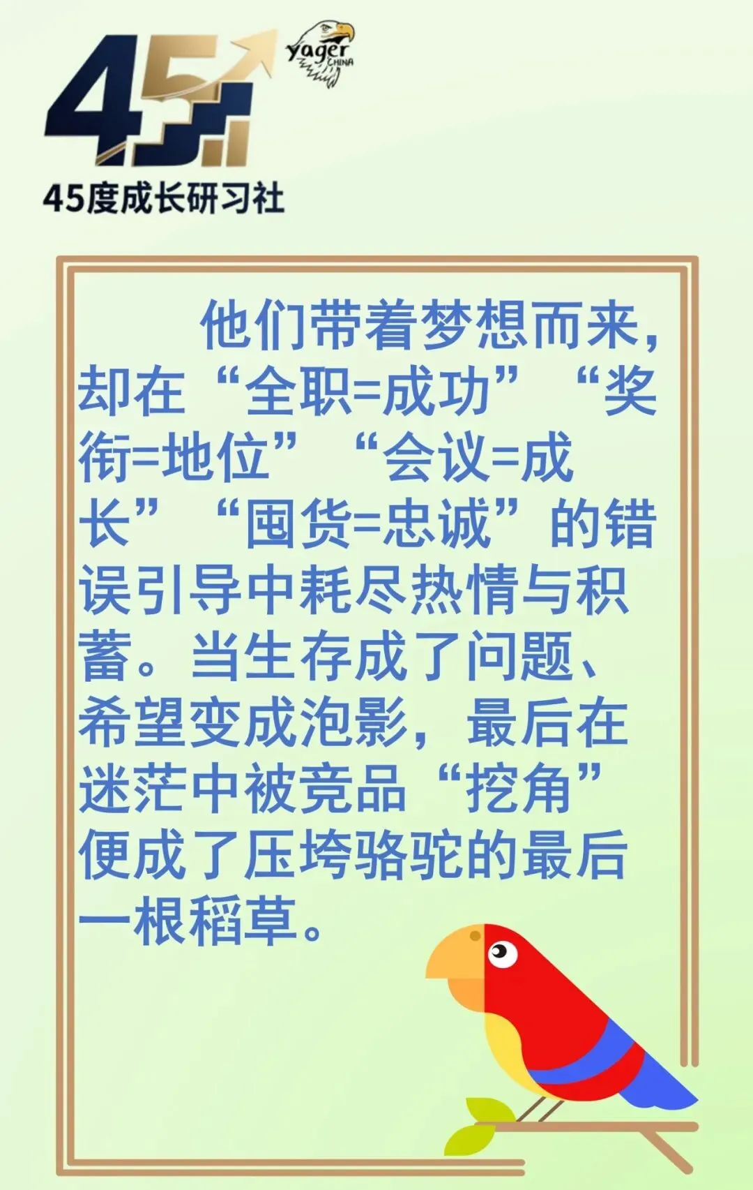 45°成长研习社的名字,灵感来源于“45°人生”这个概念。如果把人生比作90°直角,向上90°是拼命内卷,向右0°是彻底躺平,而45°就是介于两者之间的平衡态——不盲目激进,也不消极摆烂,像起跑前蓄力的姿势,既保持进取的力量,又留有余地调整呼吸。我们希望安利伙伴在经营事业时,不用“卷”到牺牲生活,也不用“躺”到放弃目标,而是在45°的平衡里,结合全球三大成人培训公司英特莱德的系统,获得专业的培训、系统的学习和持续的成长改变。通过英特莱德的个人成长课程,提升经营能力和情商!45度成长研习社!在这里,我们一起直面挑战,突破自我。无论你是想提升技能,还是寻找人生新目标,这里都能满足你。45度,是努力的角度,更是成长的态度。加入我们,解锁更好的自己!