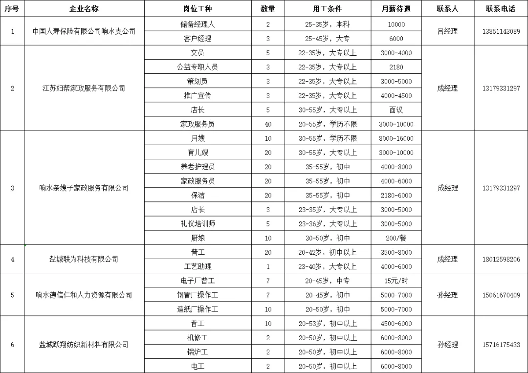 诚聘人才网销售(五险)4000-10000元/月节日福利 | 免费培训 | 五险 | 加班补助 | 晋升空间企业名称:响水网工作要求:负责人才网销售业务,通过电话探求企业的招聘需求,推荐相应的招聘方面服务。 工作要求:适合女性23-36周岁以内,形象要好,有电话销售工作经验并且愿意继续从事销售行业,会基本的电脑操作。 薪资待遇:工资无责底薪2500+绩效奖金+提成+五...长按识别二维码,了解更多诚聘文员|网络编辑|(全职实习都可以)2500-6000元/月节日福利 | 免费培训 | 五险 | 加班补助 | 晋升空间企业名称:响水网工作要求:因发展需要招聘运营专员(编辑)两名 岗位职责: 1、负责网站,公众号,APP日常运营维护; 2、对热点事件及时了解,深度挖掘及回馈报道; 任职要求: 1、具有较强的新闻敏感性,能对网络和网友的特色精准把握; 2、专科以上学历,有相关网络...长按识别二维码,了解更多诚聘酒店前台2800-3000元/月免费培训企业名称:响水县星澄泊境轻奢酒店工作要求:宾馆前台 3个人轮休 一个白班 一个夜班一个休息 有经验者优先长按识别二维码,了解更多诚聘客户成功专员3000-8000元/月住房公积金 | 节日福利 | 免费培训 | 晋升空间 | 五险企业名称:江苏独树科技有限公司工作要求:职位描述: 我们是一家专注于为企业主提供高效客户连接服务的公司,拥有自主研发的系统平台,帮助企业精准匹配下游客户资源。现因业务扩展,诚聘一位客户成功专员,负责已成交客户的持续服务与关系维护,助力客户实现业务增长,提升客户满意度和忠诚度。 主...长按识别二维码,了解更多诚聘剪线头(五险+开发区)2500-5000元/月加班补助 | 节日福利 | 带薪年假 | 工作餐 | 晋升空间 | 年度旅游 | 定期体检 | 五险企业名称:江苏辰霏体育用品有限公司工作要求:剪线头岗位,计件工资,月综合收入2500--5000 要求人选吃苦耐劳.细心。视力好。 管午餐和晚餐。转正后缴纳五险。 有兴趣可以直接联系 车间姜主任 150****1597 ...长按识别二维码,了解更多诚聘集装袋缝纫工7000-10000元/月提供食宿企业名称:响水中祥塑料包装有限公司工作要求:因新接订单需求,现面向响水及周边地区急招集装袋(吨袋)缝纫工80名,具体招聘详情如下: 薪资福利 1. 计薪方式:计件工资,月薪7000-10000元,多劳多得 2. 工作时间:长白班,作息规律 3. 食宿待遇:免费工作餐,外地员工包食...长按识别二维码,了解更多诚聘普工(上六休一)3500-8000元/月加班补助 | 节日福利 | 工作餐 | 晋升空间 | 五险企业名称:盐城联为科技有限公司工作要求:男女不限,会写字认识字,能配合加班,正常上六休一,早8点到晚20点。部分岗位两班倒长按识别二维码,了解更多诚聘缝纫工➕五险(开发区)5500-9000元/月加班补助 | 节日福利 | 带薪年假 | 工作餐 | 晋升空间 | 年度旅游 | 定期体检 | 五险企业名称:江苏辰霏体育用品有限公司工作要求:开发区新开生产线 现面向响水及周边地区急招熟练车工50名 工艺简单 上手快 计件工资 薪资5500~9000上不封顶 多劳多得 上满28天 再加满勤200 提供工作餐 提供免费宿舍 感兴趣直接电话咨询 姜主任150****1597...长按识别二维码,了解更多诚聘收费员3400元节日福利 | 餐补企业名称:响水佳新物业有限公司工作要求:男女不限,年龄在45周岁左右,初中以上学历,语言沟通能力强,月薪3400+提成,月休4天,交社保,有餐补,过节福利等,有相关经验者优先!长按识别二维码,了解更多诚聘保安队长面议企业名称:响水佳新物业有限公司工作要求:身体健康,有相关管理小区工作经验者优先,工资面议长按识别二维码,了解更多诚聘消控员面议节日福利 | 免费培训企业名称:响水佳新物业有限公司工作要求:身体健康,持有初,中级消防设施操作证,工作环境优美,月休4天,待遇面议长按识别二维码,了解更多诚聘水电工(长白班+月休4天)面议节日福利 | 免费培训企业名称:响水佳新物业有限公司工作要求:物业公司招聘水电工2名, 持电工特种作业证,熟悉强弱电,电梯、消防、安保系统等设施的维护保养。身体健康,责任心强,长白班,月休4天,工作环境舒适。 特别说明:打电话请说在响招人才网看到的。长按识别二维码,了解更多诚聘置业顾问面议企业名称:响水县聚响人力资源有限公司工作要求:响水华庭置业有限公司 招贤纳士 职等你来 置业顾问 8名 (高薪资 /晋升空间大) 1.形象气质佳,思路清晰、亲和能力强、综合素质高 2.有较强的语言表达能力和沟通协调能力 3.大专及以上学历(有经验者可适当放宽) 工作区域:响水 有意者电...长按识别二维码,了解更多诚聘吊带机挡车工7000-10000元/月企业名称:响水中祥塑料包装有限公司工作要求:招吊带机档车工,45岁以下,工资7000-10000元之间!消息不常看,合适的直接电话联系!长按识别二维码,了解更多