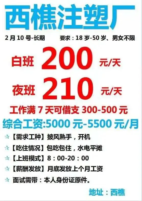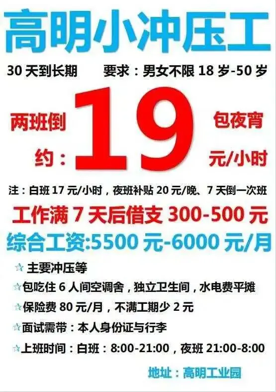 福利:包吃住(宿舍4人间,空调热水器),免体检,入职7天可借支300-500元