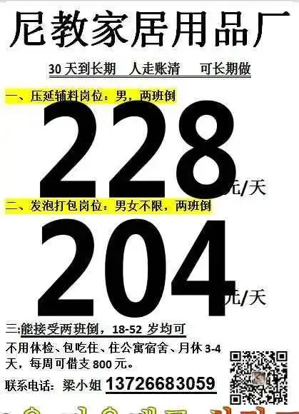 福利:包吃住(4人间,空调热水器),免体检,做满7天可借支300-500元