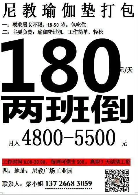 薪资待遇:两班倒,包吃住,工作满3天后每日下班发100元
