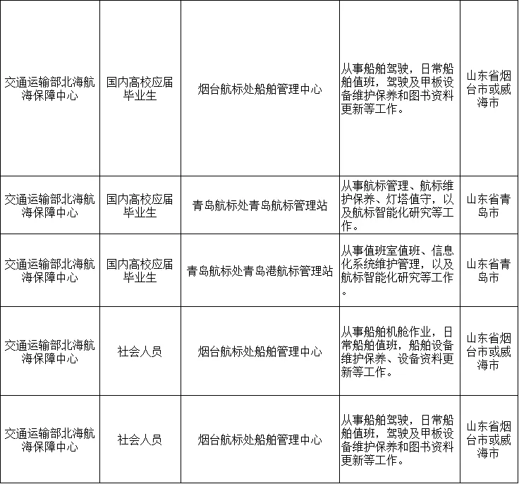 参加本次统一公开招聘的单位为交通运输部北海航海保障中心、交通运输部东海航海保障中心、交通运输部南海航海保障中心、中国船舶油污损害理赔事务中心、上海海事局后勤管理中心、辽宁海事局后勤管理中心、河北海事局后勤管理中心、广东海事局后勤管理中心、广西海事局后勤管理中心、湛江海事局后勤管理中心。