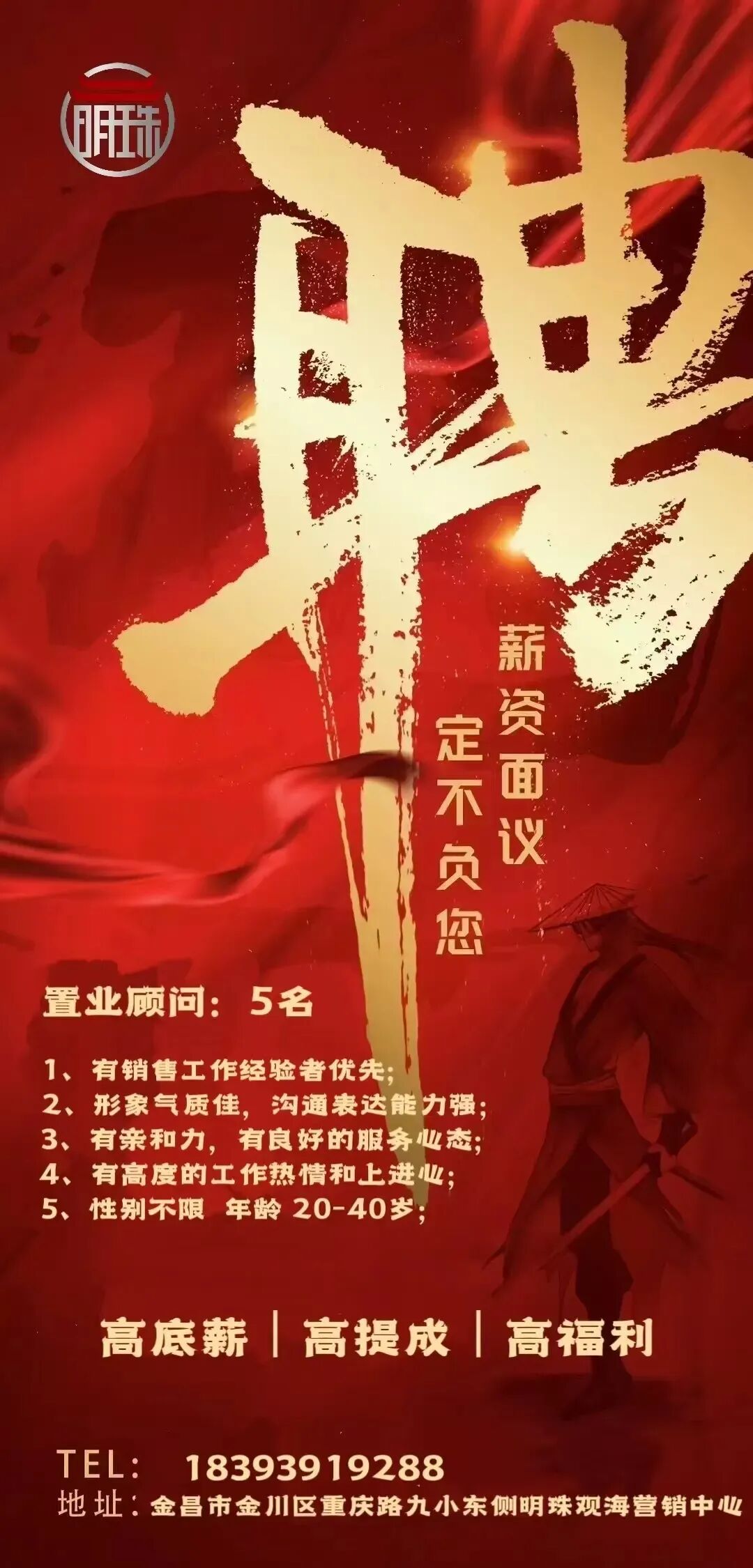 金昌明珠观海房地产因业务需要招聘岗位若干名,工作坏境舒适,具体如下图: