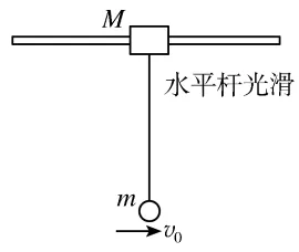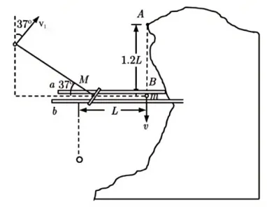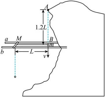 例题 6 [攻坚](2025•湖南卷•T15)某地为发展旅游经济,因地制宜利用山体举办了机器人杂技表演。表演中,需要将质量为的机器人抛至悬崖上的点,图为山体截面与表演装置示意图。为同一水平面上两条光滑平行轨道,轨道中有质量为的滑杆。滑杆用长度为的轻绳与机器人相连。初始时刻,轻绳绷紧且与轨道平行,机器人从点以初速度v竖直向下运动,点位于轨道平面上,且在点正下方,。滑杆始终与轨道垂直,机器人可视为质点且始终作同一坚直平面内运动,不计空气阻力,轻绳不可伸长,,重力加速度大小为。