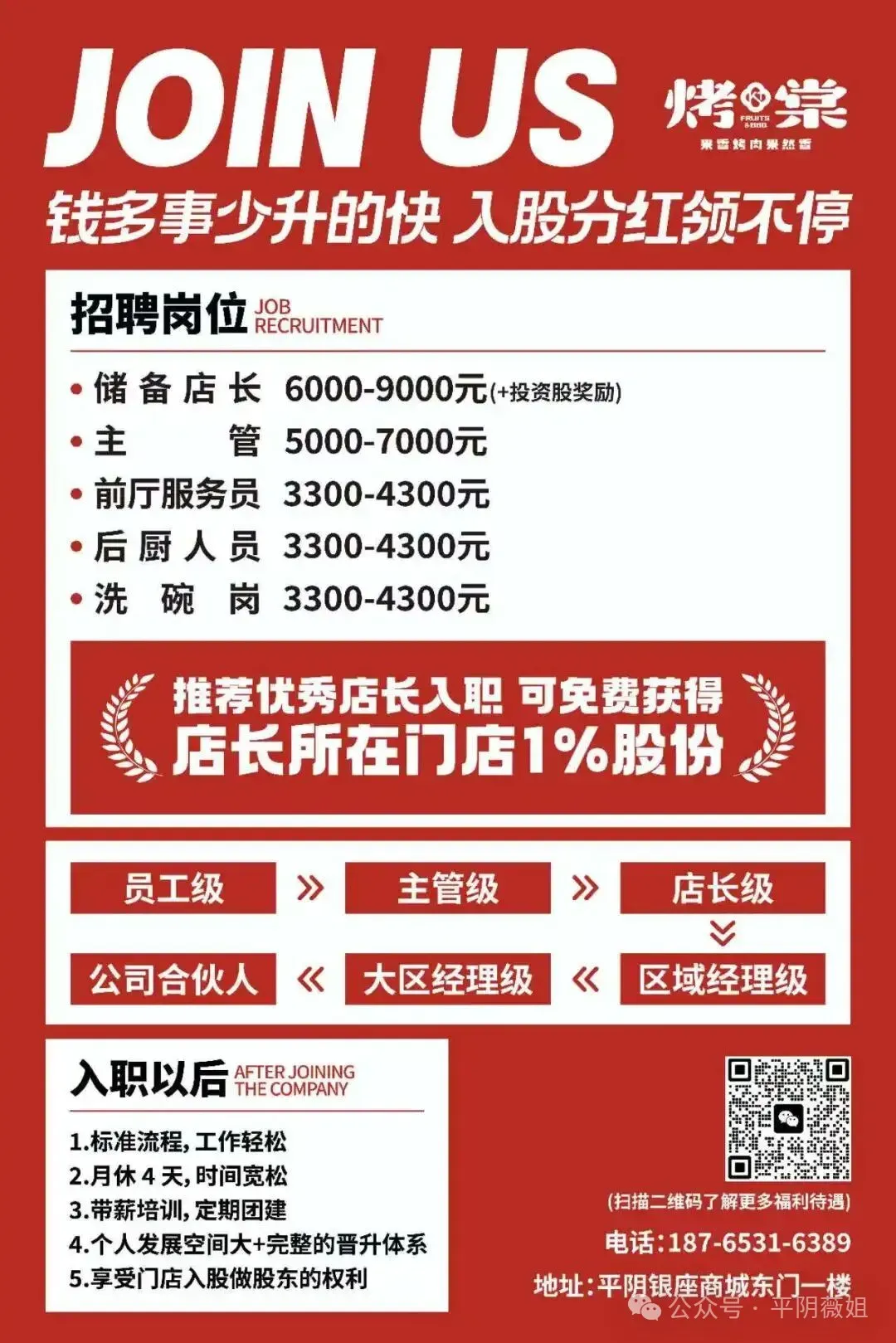 ▼【店铺招聘】烤 棠 招聘招聘岗位储备店长 6000-9000元(+投资股奖励)主管5000-7000元前厅服务员!3300-4300元后厨人员3300-4300元洗碗 岗 3300-4300元入职以后1。标准流程,工作轻松2。月休4天,时间宽松3。带薪培训,定期团建 (扫描二维码了解更多福利待遇)4。个人发展空间大+完整的晋升体系5。享受门店入股做股东的权利电话:18765316389地址:平阴银座商城东门一楼(联系电话:18765316389)
