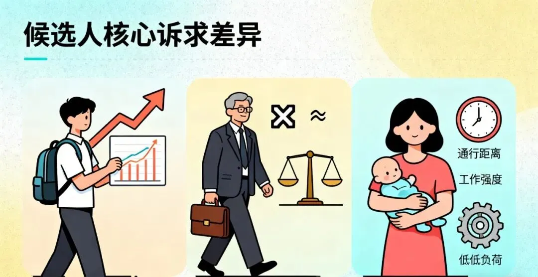 不同候选人的核心诉求天差地别:刚毕业3年的年轻人可能更看重“成长空间”,资深从业者可能更在意“薪资回报”和“工作稳定性”,宝妈群体可能优先考虑“通勤距离”和“工作强度”。